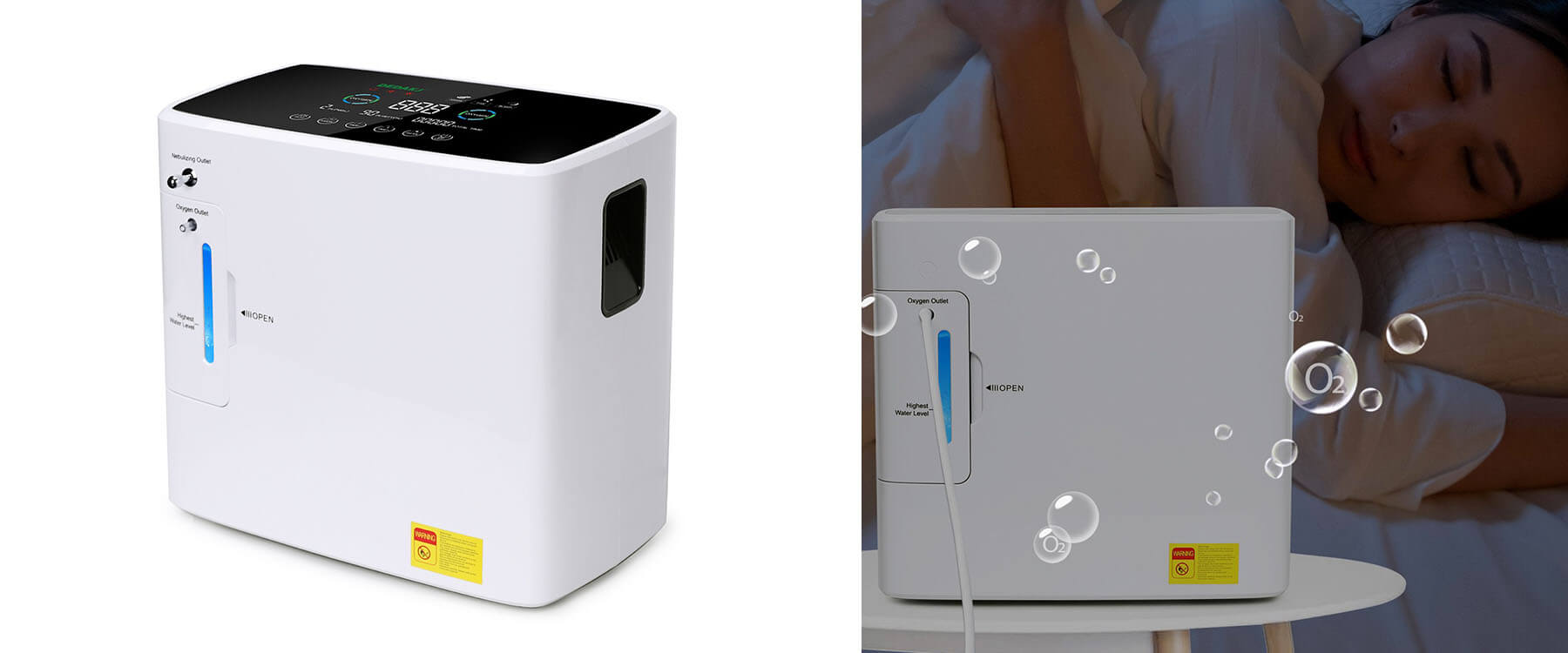 Compact and lightweight (1.45 kg), delivers 93% ±3% oxygen purity with ultra-quiet operation (≤30 dB). Provides 1.5–4 hours battery life, supports AC 100–240V, and is flight-approved for travel.