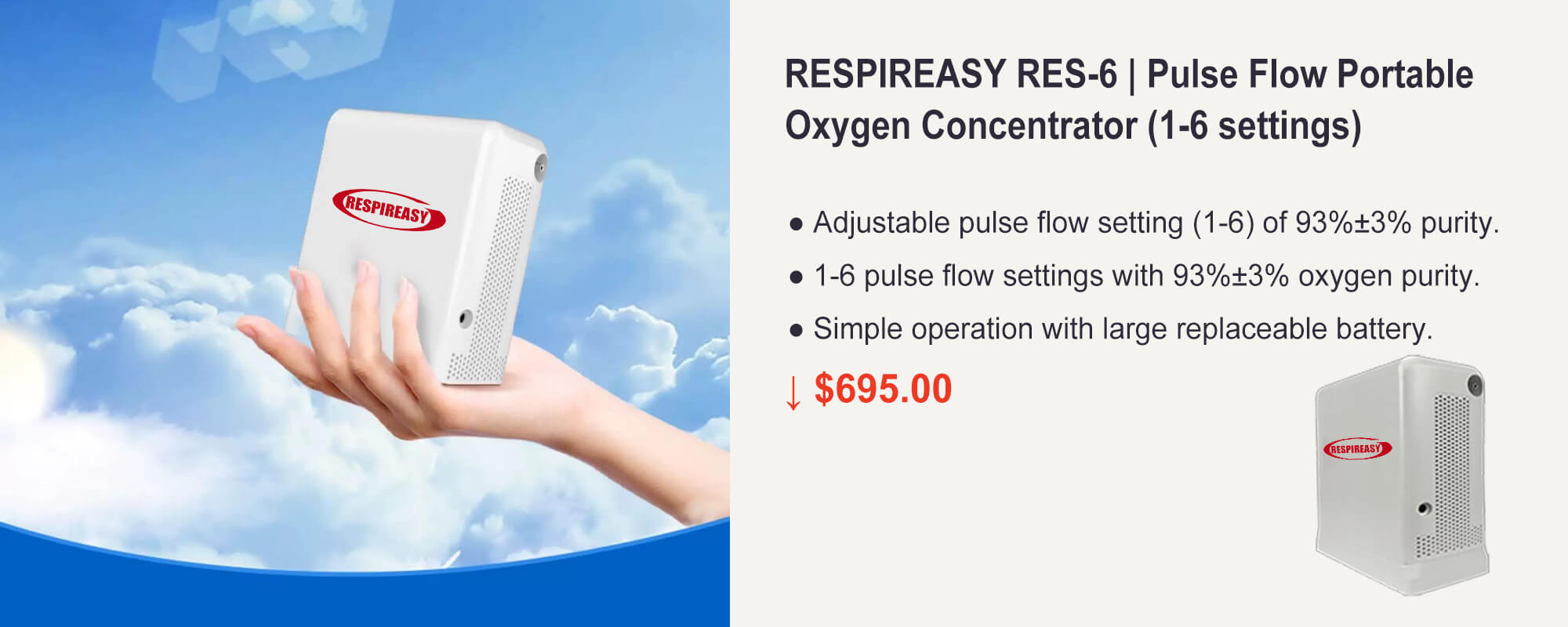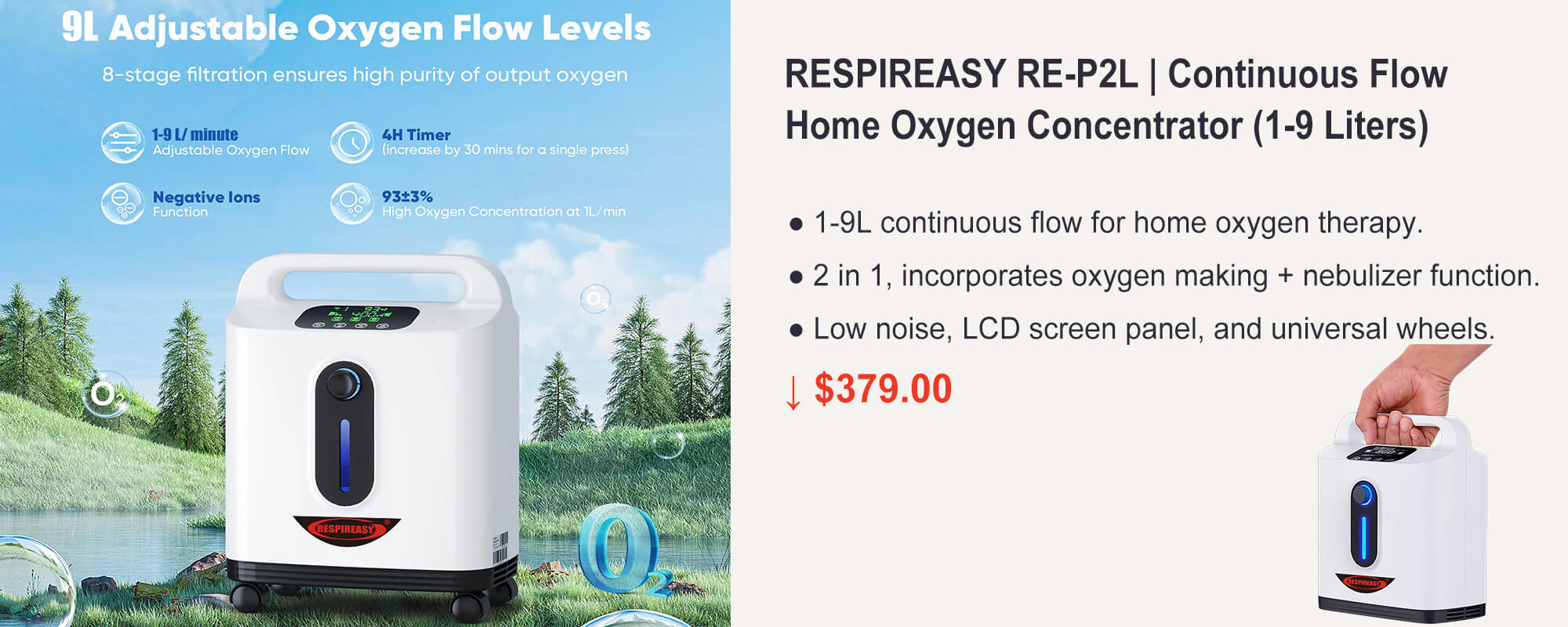 RESPIREASY Home Use Portable Oxygen Concentrator 2-9 Liter Per Minute Continuous Flow O2 Concentrator Machine 110V/220V RE-P2L